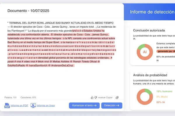 Decopy AI calificó el texto con un 82 % de probabilidad de haber sido generado con inteligencia artificial.
