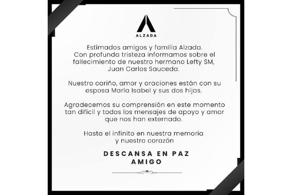 El sello discográfico Alzada confirmó la muerte del cantante Juan Carlos Sauceda, conocido como Lefty SM, y envió sus condolencias a familiares y amigos.