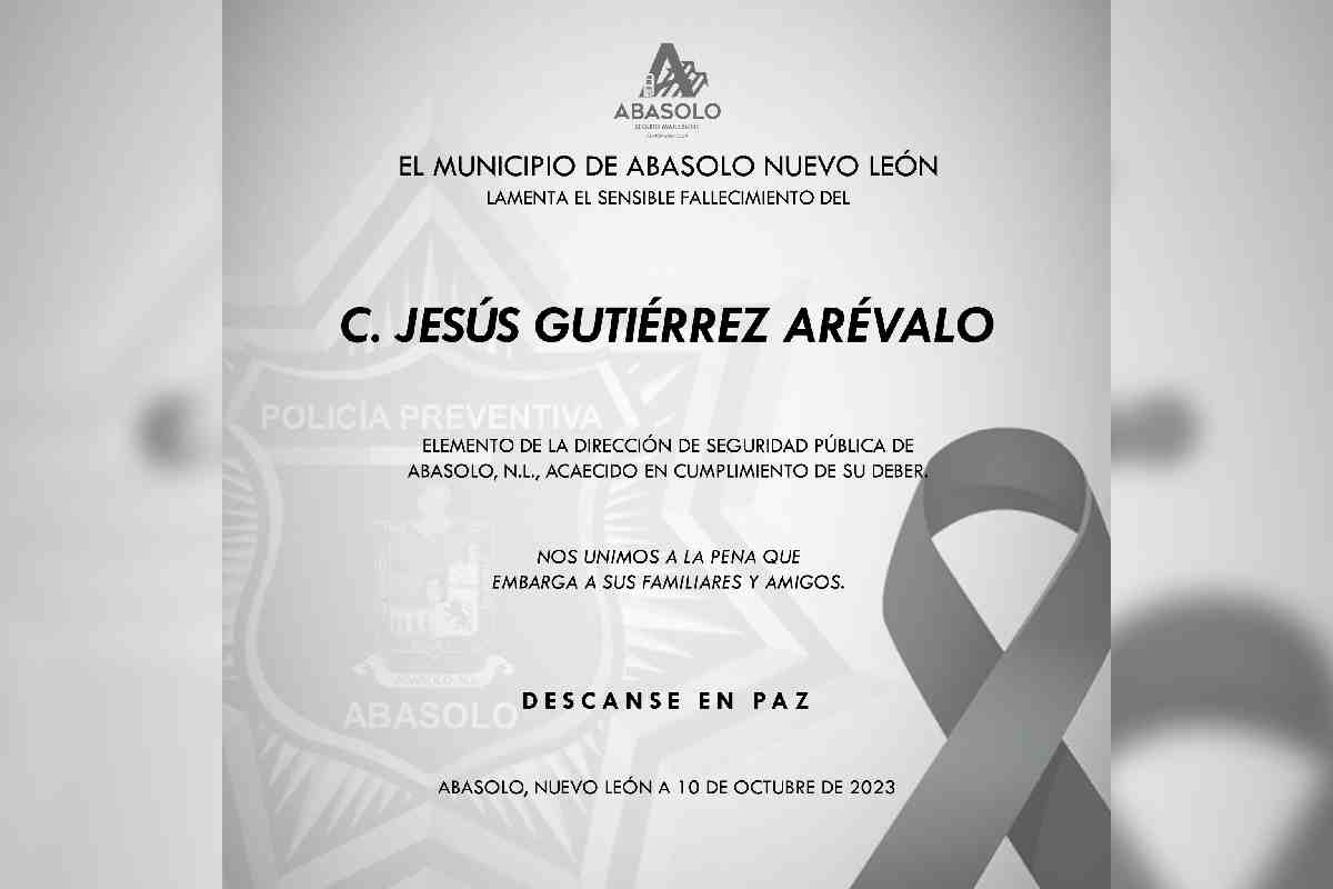 En su cuenta oficial, el municipio de Abasolo lamentó el fallecimiento de Jesús Gutiérrez Arévalo, elemento operativo de la Dirección de Seguridad Pública municipal.