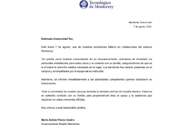 El Tec también informó que se dio aviso a las autoridades competentes “quienes declararon su fallecimiento” y expresó sus condolencias además de reiterar el apoyo a la familia.