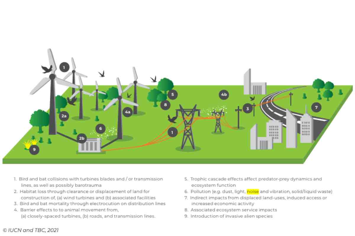 Las aves que vuelan en la zona de barrido del rotor de la turbina pueden colisionar, sufrir lesiones graves o fallecer. En Canadá tienen registrada una tasa de mortalidad media anual de 8.2 aves por megavoltio, por turbina. Según la investigación de la IUCN, en Sudáfrica murieron el 30% de las aves registradas en los parques eólicos y sus alrededores, porcentaje que puede llegar al 42%.