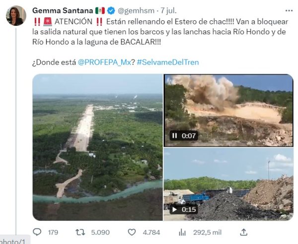 “Están rellenando el Estero de chac!!!! Van a bloquear la salida natural que tienen los barcos y las lanchas hacia Río Hondo y de Río Hondo a la laguna de BACALAR!!!”, escribió la ambientalista Gemma Santana.