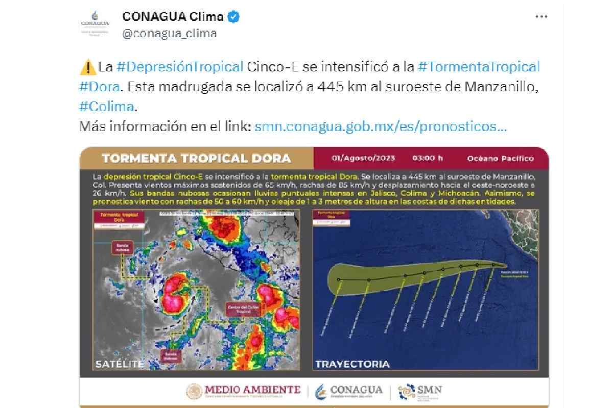 La madrugada de este martes se formó la tormenta tropical “Dora” al suroeste de Manzanillo, Colima, informó el Servicio Meteorológico Nacional (SMN).