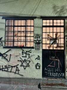 Entre las frases que cubrieron la fachada del recinto se leían consignas como “sionismo = nazismo”, “aquí hay terroristas” y cifras alusivas al conflicto en Medio Oriente como “200 mil niñxs asesinados”. Además de los grafitis, grupos de manifestantes se congregaron afuera de la galería gritando “fuera sionistas de Palestina” y realizando una protesta donde incluso bailaron salsa frente a los accesos.