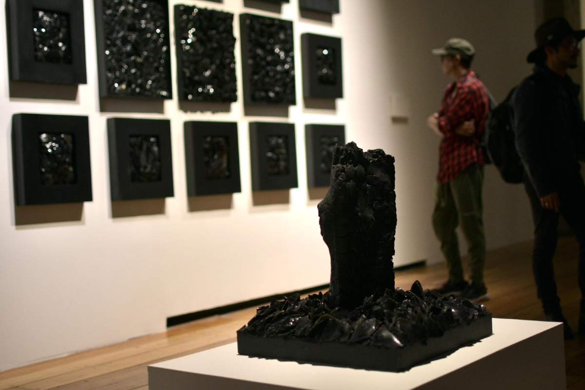 Esta muestra reúne 94 obras de la artista en distintos formatos y técnicas que van desde esculturas hasta cuadros hechos con diferentes técnicas y materiales naturales como carbón, tierra, barro obsidiana y mas. Todo esto en diferentes tonalidades de negro que invitan al espectador a repensar todo.