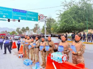 En esta ocasión, mujeres policías y militares esperaron cerca del Parque Fundadores y repartieron botellas de agua a las asistentes.