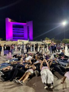 Al terminar la marcha, el piso se fue llenando con las pancartas y lonas de las asistentes. Un grupo de mujeres se acostó en el piso en un círculo en donde cantaban consignas y se pasaban el megáfono para contar sus historias y testimonios.