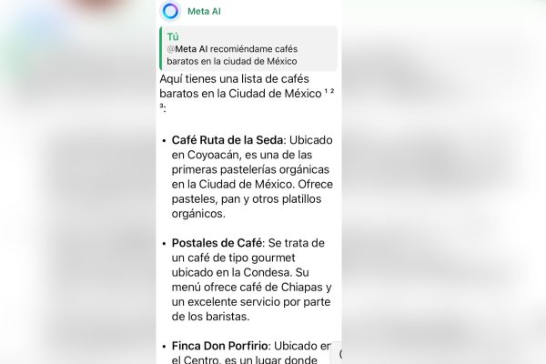 Una vez dentro deberás escribir mensajes o preguntas como “recomiendame cafés baratos”, “¿va a llover hoy?”, “cómo llego a Metro Pino Suárez”, o “escribe un texto para pedir una pizza” y enviarlo como en cualquier otro chat. Al poco tiempo, la IA te responderá.