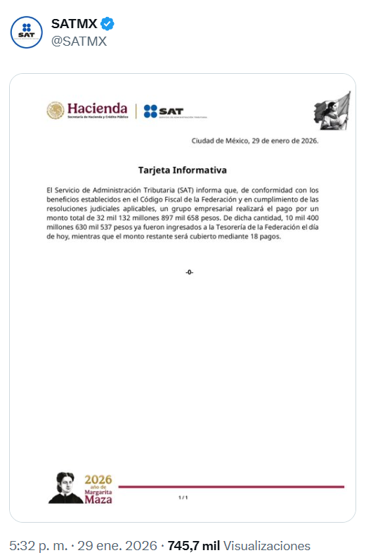 De acuerdo con un comunicado del SAT, de los 32,132 millones 897,658 pesos que debe cumplir el empresario luego de obtener un descuento de los 51 millones que había ordenado originalmente la Suprema Corte de Justicia de la Nación (SCJN), Salinas Pliego llevó a cabo un primer pago de 10,400 millones 630,537 pesos, el 29 de enero, los cuales ingresaron a la Tesorería de la Federación.