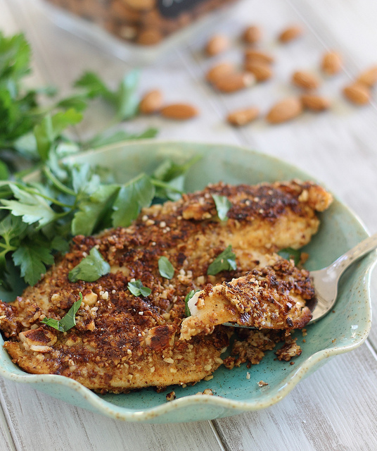 Transferir las almendras picadas a un plato. Agregar paprika y mezclar. Sazonar los filetes de tilapia generosamente con sal y pimienta. Extender la mostaza en ambos lados del filete y luego transferir a la mezcla de almendras para cubrir ambos lados.