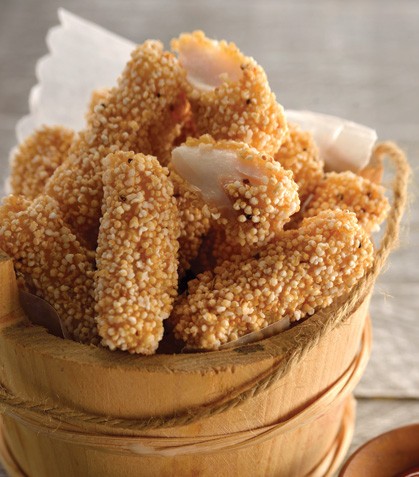 Cortar el pescado en barritas y enharinar. Pasar cada pieza de pescado por el huevo batido y finalmente por la taza de amaranto.