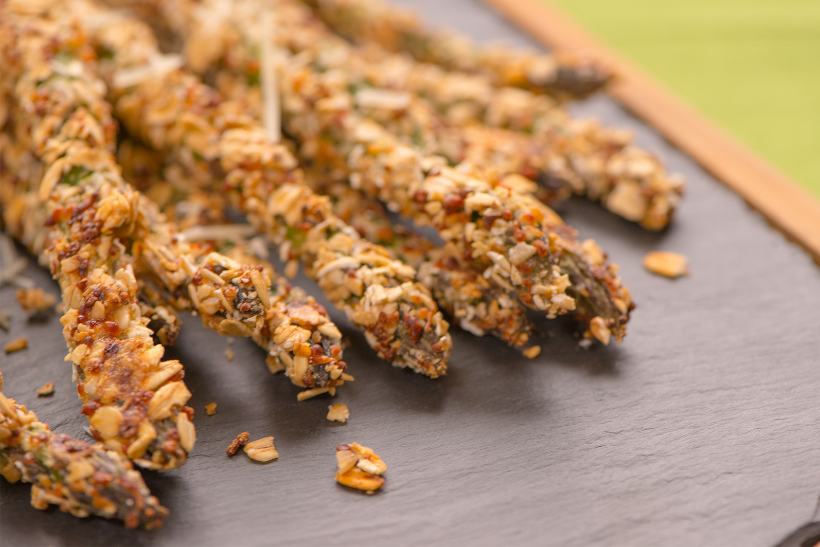 Verter los huevos en un segundo plato y sumergir cada uno de los espárragos. Una vez cubiertos de huevo, cubrir bien con la harina de avena y después con la mezcla de parmesano y avena. Ahora, colocar en la bandeja para hornear.