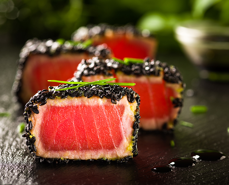 Poner a cocinar los filetes en el aceite de ajonjolí asegurándose de cocinar toda el exterior pero dejando crudo el interior (aproximadamente 2 minutos de cada lado).