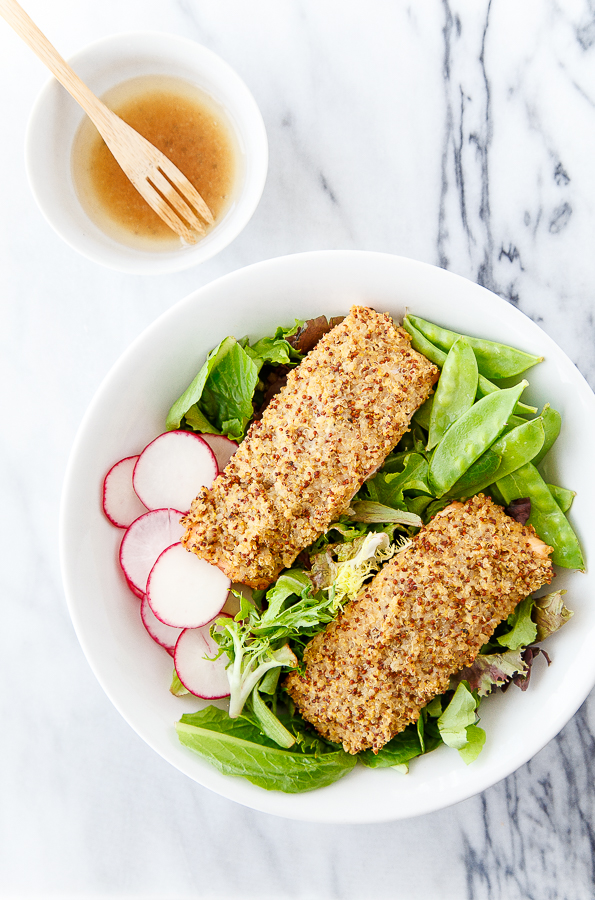 En un tazón pequeño, combinar la quinoa, la mostaza, la sal y la pimienta. Mezclar bien. Colocar la mezcla de quinoa en un recipiente y cubrir los filetes de salmón.