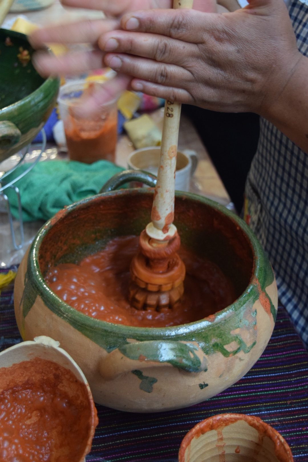 Esta mujer que aprendió a cocinar desde los ocho años gracias a su madre hace un ceviche de hongos, unos tacos de amarillo de hongos espesado con papas y un vistoso atole colorado que lleva cacao blanco, rojo, maíz amarillo, canela y axiote, una bebida que se consume en las bodas.