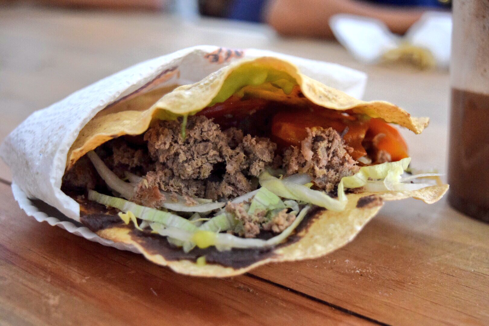 Las tostadas, fritas en un cazo con manteca, se embarran de guacamole, pasta de frijol y, ahora sí, están listas para recibir la salchicha en trozos, lechuga y jitomate. Es como si fuera un sándwich, pero con tostadas en lugar de pan.