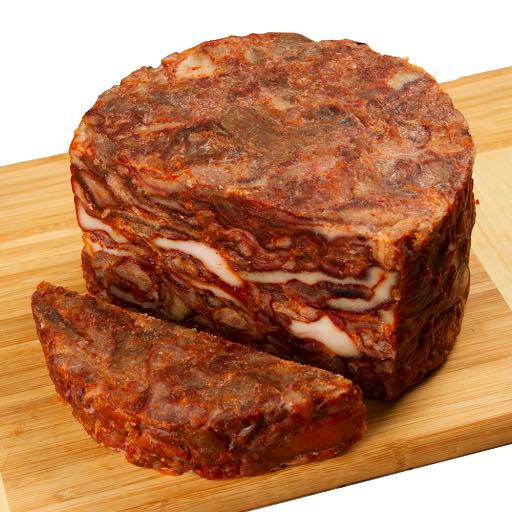 Esos trozos se colocan en moldes -generalmente redondos, parecidos al disco de un parmiggiano- y se prensan para escurrir toda la grasa y que tome una textura homogénea. Esta presentación se puede conseguir en mercados o en carnicerías de barrio.