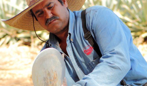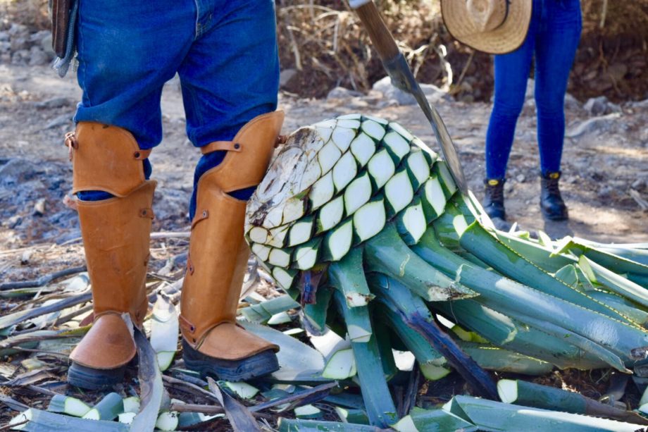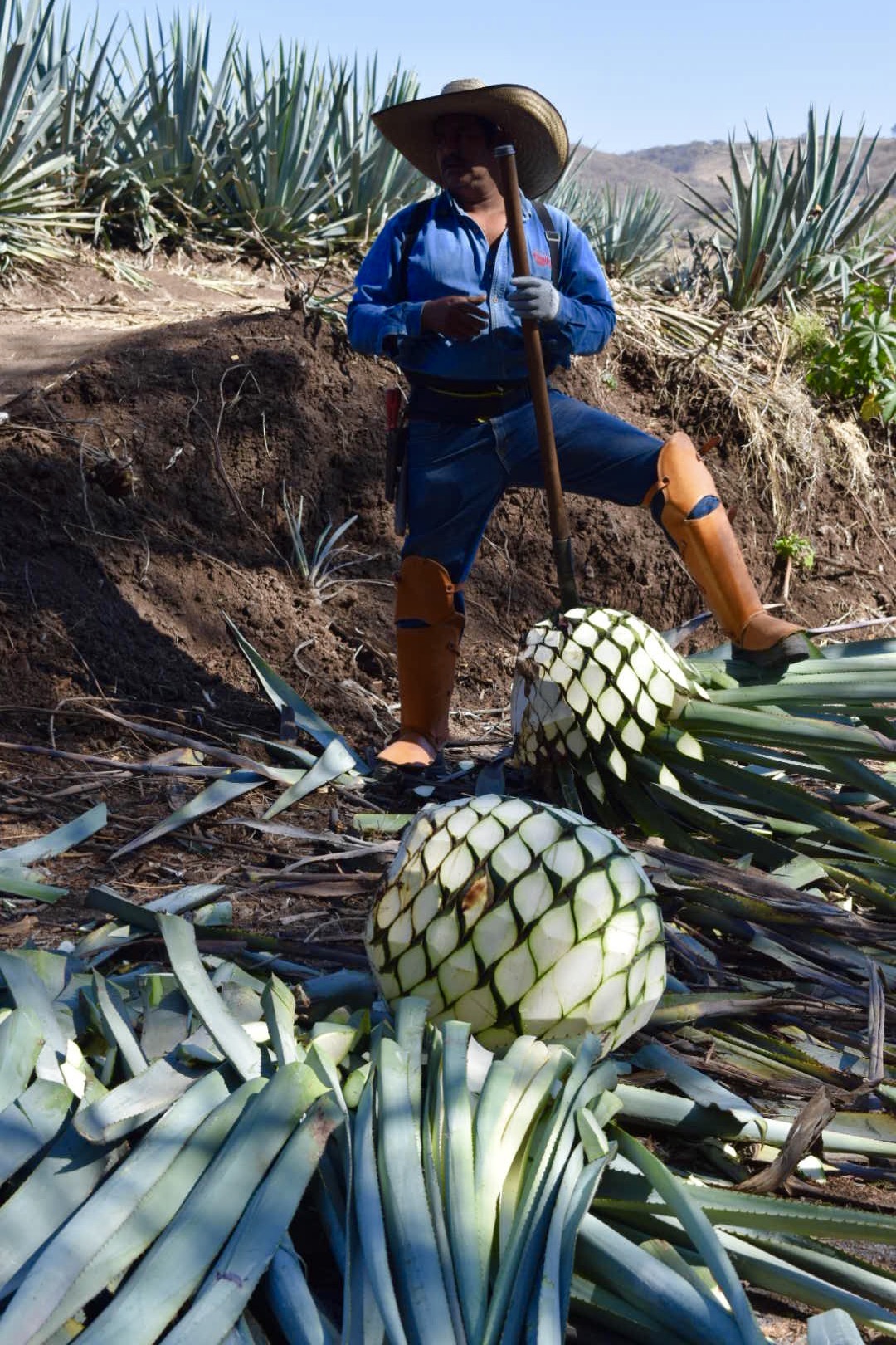Pedro Chávez sabe que cuando se maneja un instrumento pesado y peligrosamente afilado tan cerca de los pies hay que tener cuidado. Ese instrumento que lleva en las manos se llama coa y es lo que utiliza para cortar y limpiar los agaves que posteriormente serán transformados en tequila.