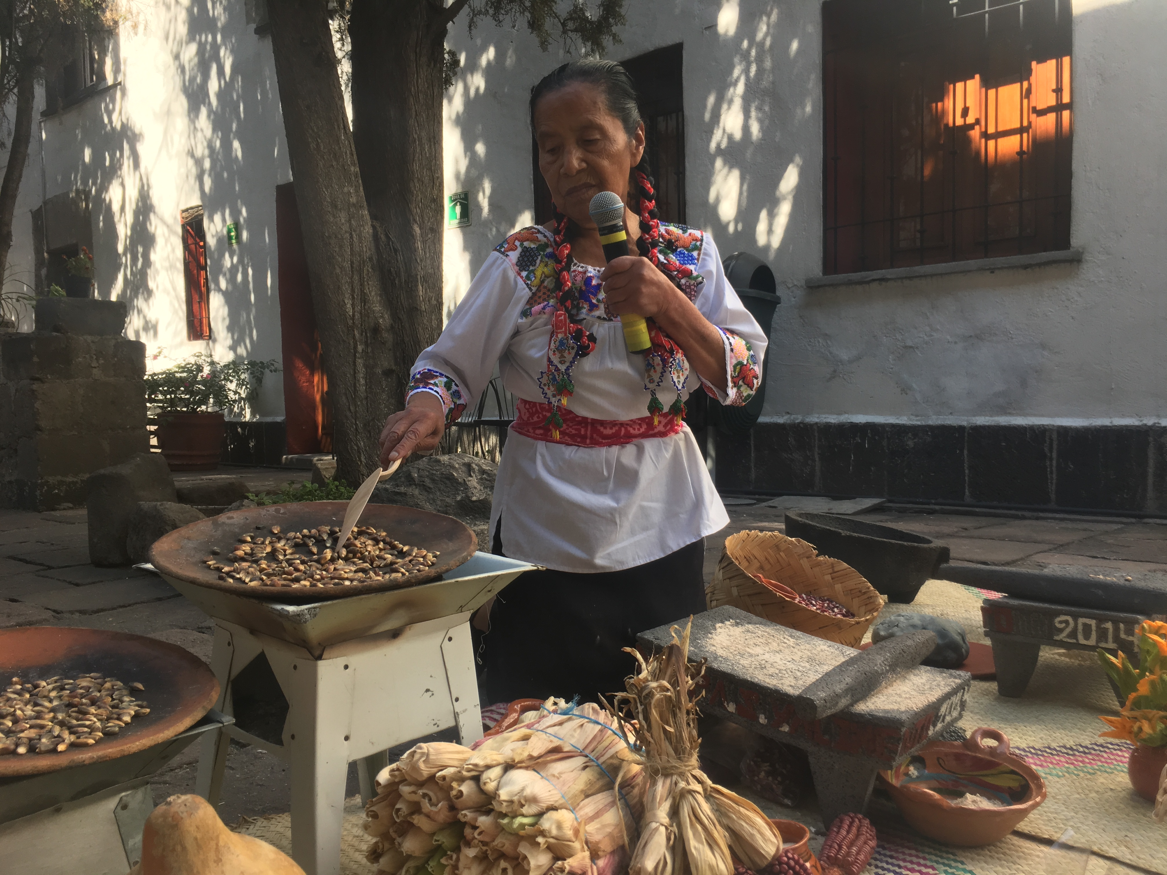 La señora Linda Olivos Ramírez, cocinera tradicional de San Pedro Actopan en Milpa Alta, recomienda hacer pinole hincado, ejerciendo peso sobre el metate con el metlapil en movimientos de arriba a abajo. Hay que moler en cuatro, diez o veinte pasadas los granos de maíz tostado con el azúcar y la canela para que todo se integre adecuadamente.