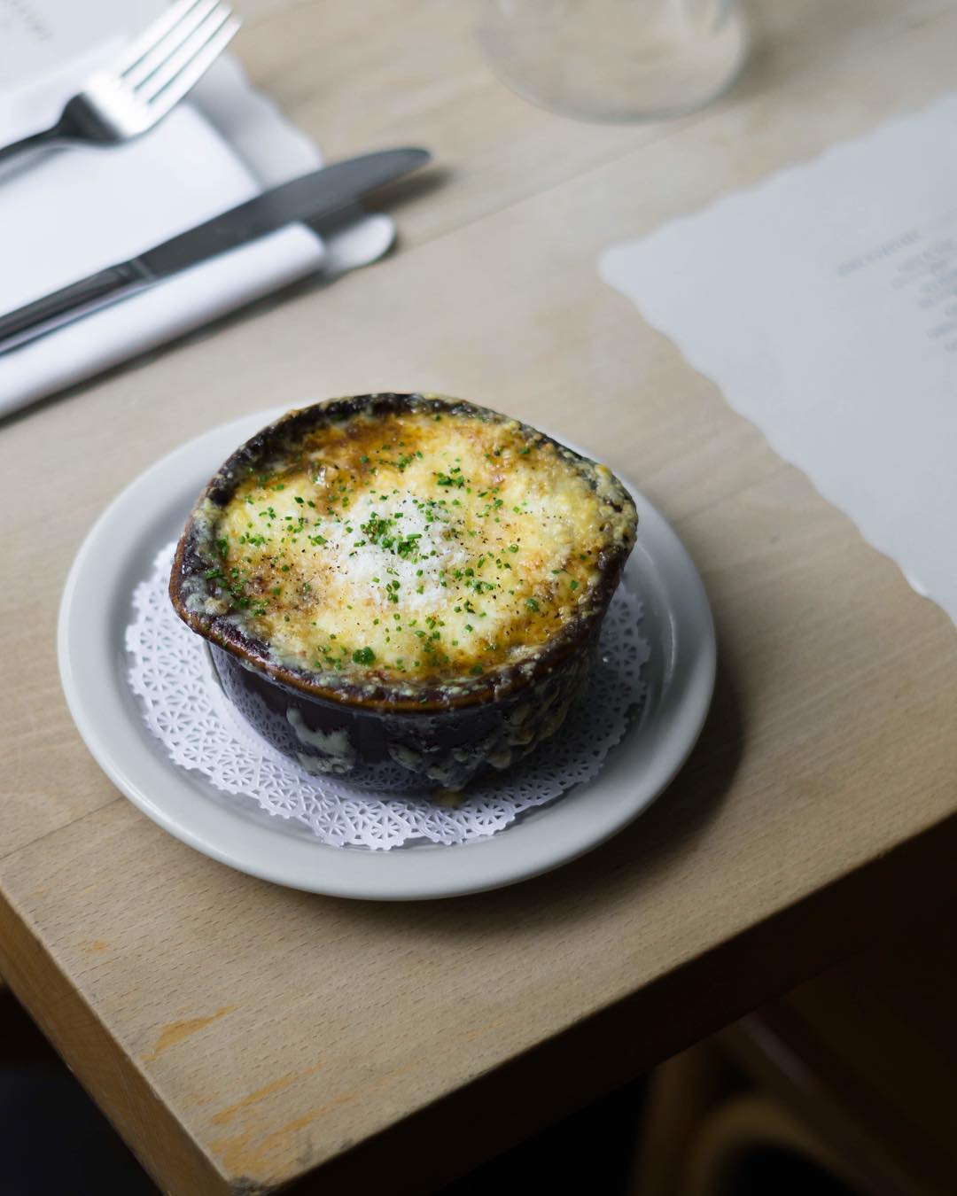 Prueba platos clásicos de la cocina francesa como la fabulosa sopa de cebolla, la ensalada Nicoise, el boeuf bourguignon y el huachinango a la Meuniere.