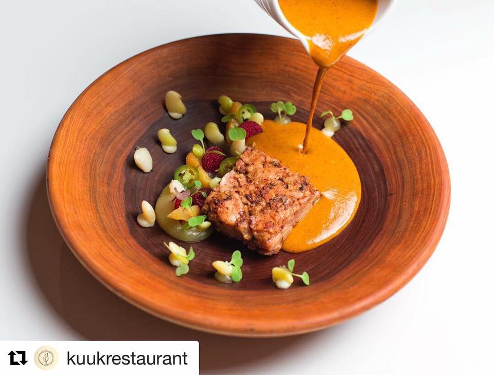 Desde el nombre del restaurante (k’u’u’k significa renacer en maya), Evia muestra la intención de crear una nueva forma de hacer cocina yucateca. Los comensales tienen dos opciones: elegir el menú degustación de 12 tiempos –un paseo por la cocina de Evia, por ingredientes de temporada y técnicas nada tradicionales de Yucatán- o pedir platos a la carta.
