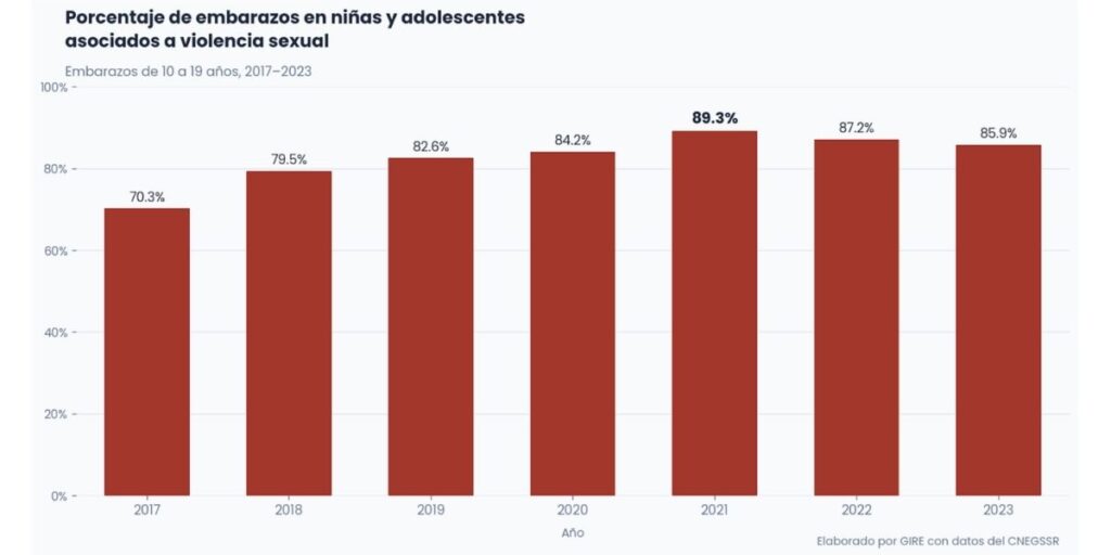 Los datos del Centro Nacional de Equidad de Género y Salud Sexual y Reproductiva (CNEGSSR) muestran una tendencia preocupante: aunque el número total de embarazos ha disminuido, la proporción de aquellos atribuibles a violencia sexual ha aumentado. En 2017, 70.3 % de los embarazos en la población de niñas y adolescentes fueron causados por violencia sexual. Para 2021, esta proporción alcanzó 89.3 % y se mantuvo elevada los siguientes dos años: 87.2 % en 2022 y 85.9 % en 2023. Así, pese a la reducción del número de embarazos, no han mejorado las condiciones de seguridad y protección de las niñas y adolescentes, y el riesgo de que sean violentadas persiste.