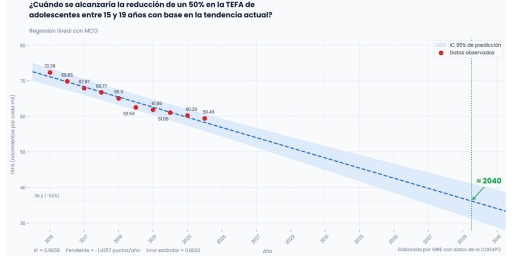 En cuanto al segundo objetivo, el panorama es similar. Entre adolescentes de 15 a 19 años, la tendencia también es descendente. La tasa específica de fecundidad adolescente (TEFA) mide cuántos nacimientos ocurren por cada mil mujeres en este grupo de edad. Mientras que, en 2015, la TEFA era de 72.4, en 2024 bajó a 59.5, lo que refleja una disminución real, aunque aún insuficiente para alcanzar a tiempo la meta. Con base en esa tendencia, la reducción necesaria —que implicaría reducir la TEFA a 36.2— se alcanzaría hacia el 2040, es decir, diez años después de la meta establecida por la ENAPEA.