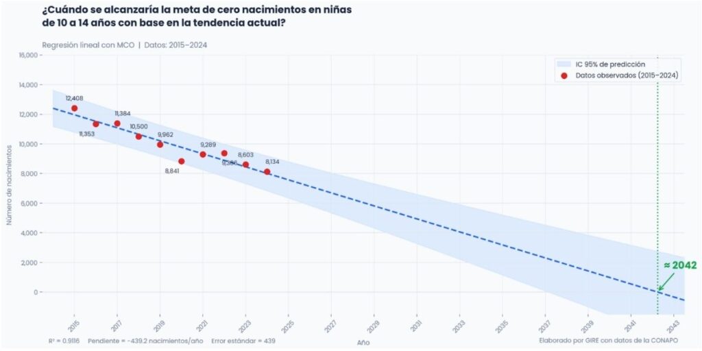 Tomando en cuenta los datos de embarazos en las poblaciones de niñas (de 10 a 14 años) y adolescentes (de 15 a 19 años) entre 2015 y 2024, GIRE realizó dos regresiones lineales —una para cada grupo de edad— con el fin de estimar en qué año podrían alcanzarse ambas metas. La regresión lineal es una herramienta estadística que identifica la tendencia de los datos a lo largo del tiempo mediante una línea que representa su comportamiento general y la proyecta hacia el futuro. En términos simples, permite responder a la pregunta: si la tendencia actual se mantiene sin cambios, ¿cuándo se alcanzaría la meta? Los resultados no son una predicción exacta, sino una proyección basada en las condiciones y tendencias observadas.