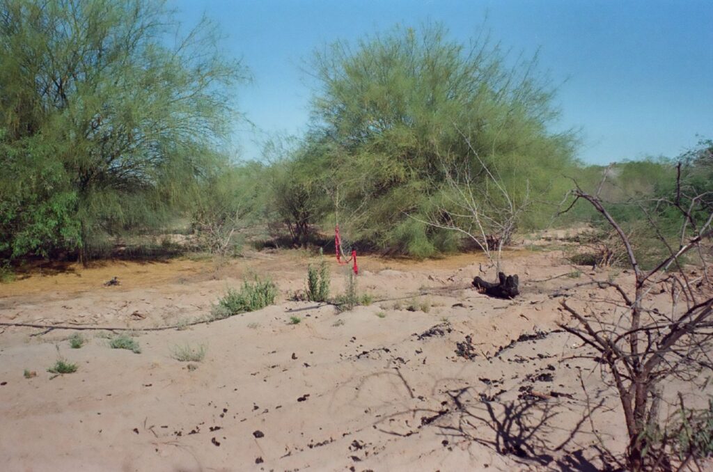 Al ingresar a la zona, atravesamos entre árboles hermosos y robustos -mezquites, álamos, palo verde- y alguna que otra planta con flores moradas que resisten entre un desierto, un río seco y un sol abrasador. Un área natural que, a simple vista, es impactante por su belleza y por la vida que puede sostener en condiciones tan adversas, pero que esconde bajo su fina arena historias que ni siquiera podemos imaginar. Paradójicamente, lo que parece ser un lugar que regenera vida también contiene en sí muerte y dolor. En palabras de una de las buscadoras, este lugar es un campo de exterminio, es un panteón clandestino, horroroso […] donde ustedes pisen, hay un cuerpo.