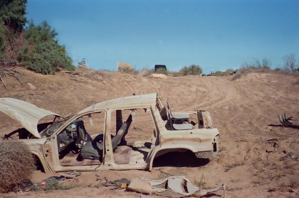 Después llegamos a un área que, al parecer, formaba parte de una zona de práctica de tiro, pues se encontraba el cascarón de una camioneta con el techo grafiteado con una diana azul y cientos de casquillos regados en el piso. Las personas nos preguntamos, entre un terreno tan complicado de circular y “vigilado”, ¿cómo es que esta camioneta llegó hasta aquí? ¿cómo es que se dispararon armas sin que nadie se percatara de ello?