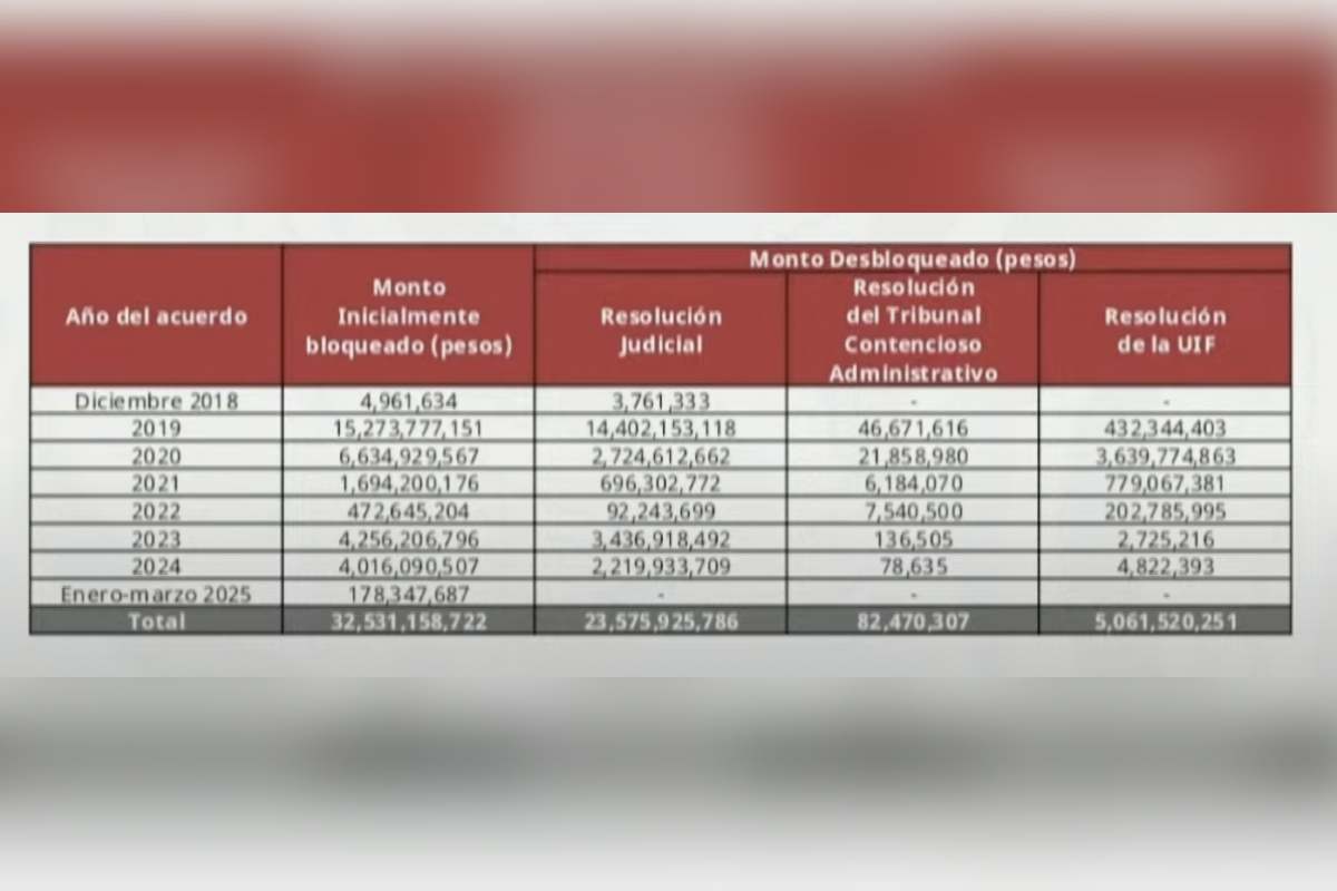 Según cifras de la UIF, de diciembre de 2018 a marzo de 2025 ha bloqueado un total de 32 mil 531 millones 158 mil 722 pesos, de los cuales 23 mil 575 millones 925 mil 786 han sido desbloqueados por resolución judicial. Mientras que poco más de 5 mil millones 61 mil pesos y 82 millones 470 mil pesos han sido desbloqueados por resolución de la propia UIF o del Tribunal Contencioso Administrativo, respectivamente.
