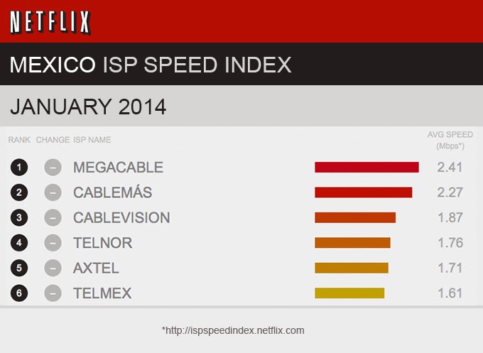 Megacable, Cablemás y Cablevisión fueron los proveedores de internet en los que Netflix registró mayores velocidades, de 2.41 Mbps,, 2.27 Mbps y 1.87 Mbps, respectivamente.
