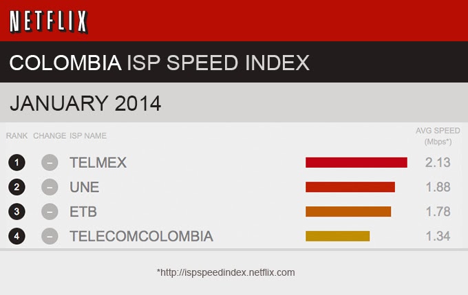 El Índice de velocidades de ISP para Netflix se basa en datos de más de 44 millones de miembros de este servicio en todo el mundo que vieron más de mil millones de horas de series y películas por mes. Las velocidades indicadas reflejan el rendimiento promedio de todas las transmisiones de Netflix en la red de cada ISP y son un indicador del rendimiento que experimentan normalmente todos los usuarios. Por lo general, una red más rápida implica una mejor calidad de imagen, tiempos de inicio más veloces y menos interrupciones.