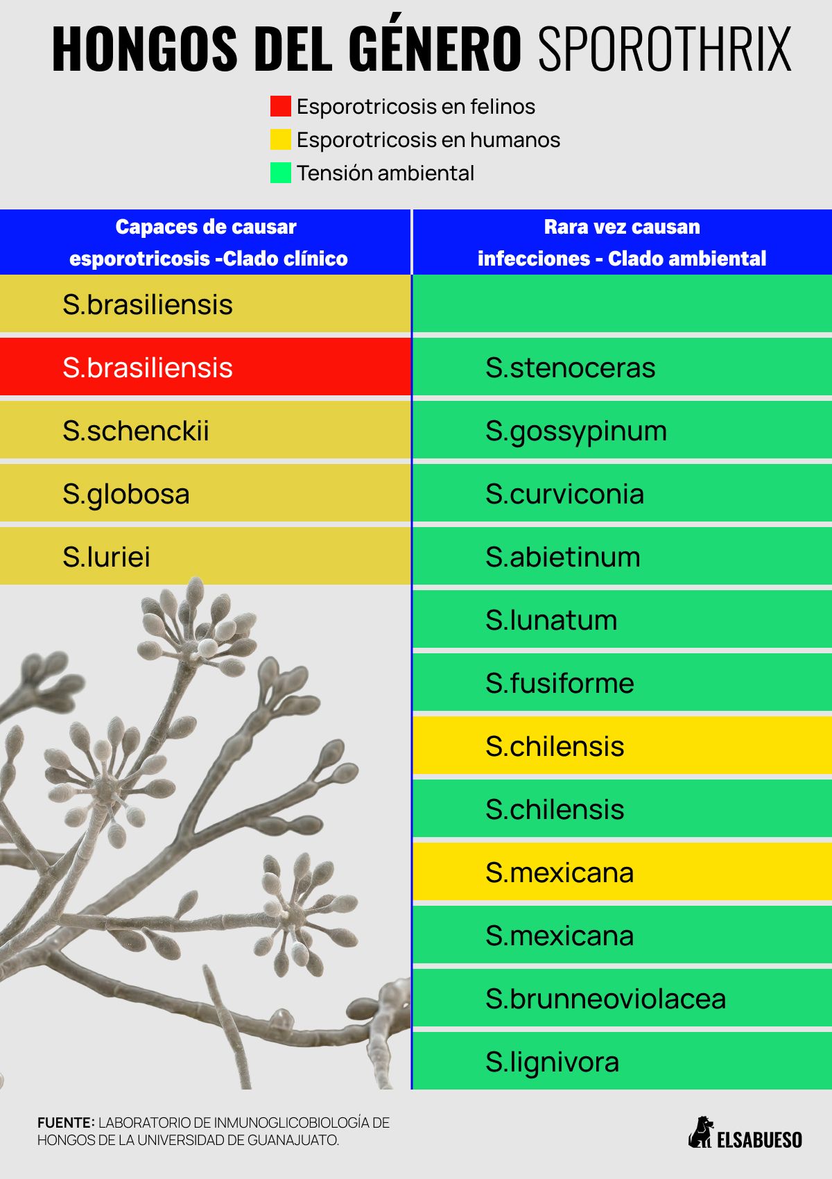 Respecto a México, hasta ahora no hay casos documentados. El Sabueso contactó tanto a la Secretaría de Salud como al Servicio Nacional de Sanidad, Inocuidad y Calidad Agroalimentaria (Senasica) para conocer si tenían registros o información de contagios de Sporothrix brasiliensis. La primera dependencia no respondió a la solicitud. La segunda entidad contestó: “No tenemos reporte de la presencia de ese hongo en el país. No hay notificación alguna de esta enfermedad”.
