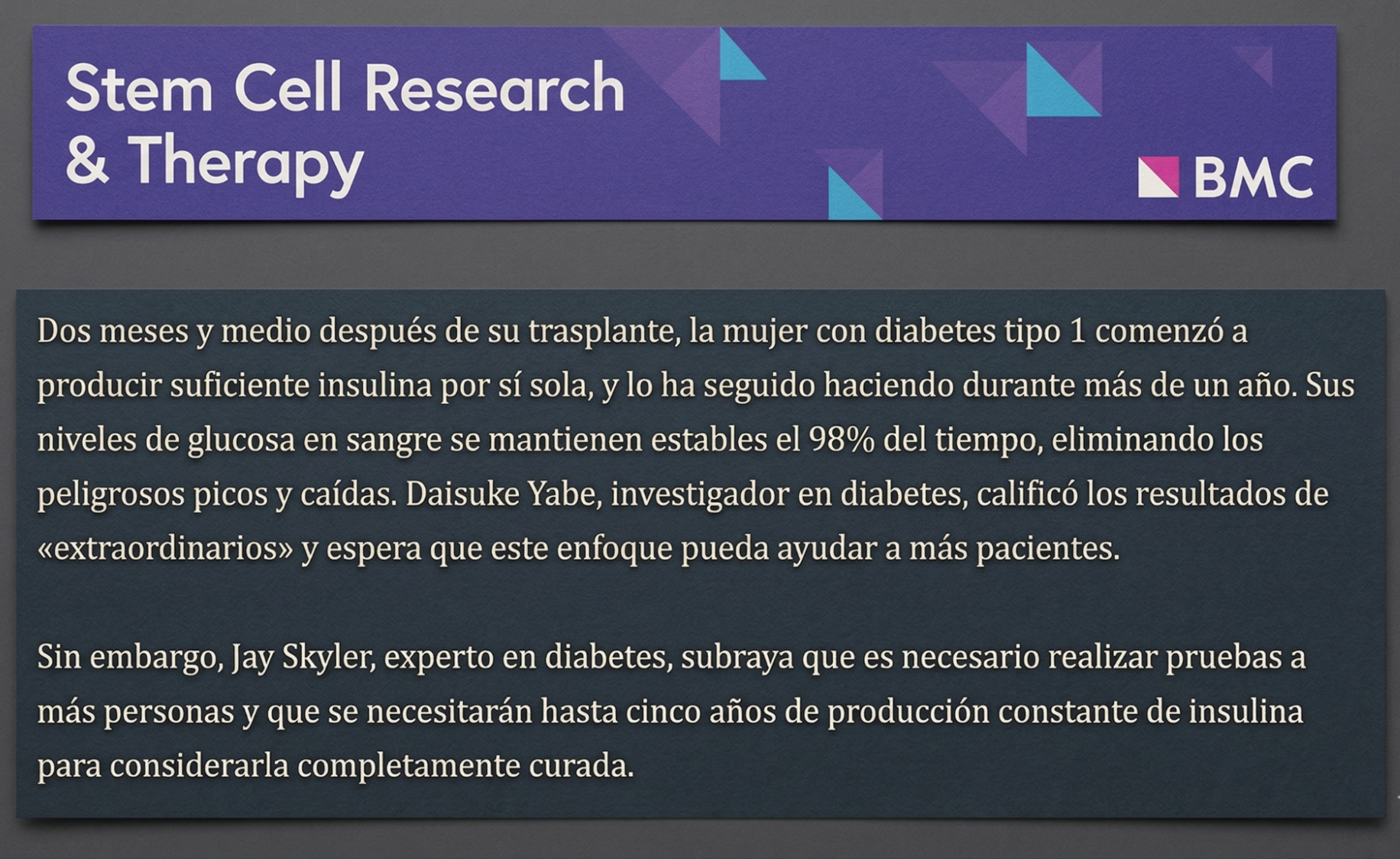 Uno de los resultados arrojó un estudio de la revista Stem Cell Research & Therapy, publicado el 20 de diciembre de 2024 y archivado en la estantería digital de la Biblioteca Nacional de Medicina de Estados Unidos (NLM, por sus siglas en inglés). Titulado “Primicia mundial: la terapia con células madre revierte la diabetes”, en este se aborda el caso de una mujer de 25 años con diabetes tipo 1, quien se convirtió en la primera persona en recibir con éxito un trasplante de células productoras de insulina derivadas de sus propias células madre reprogramadas.