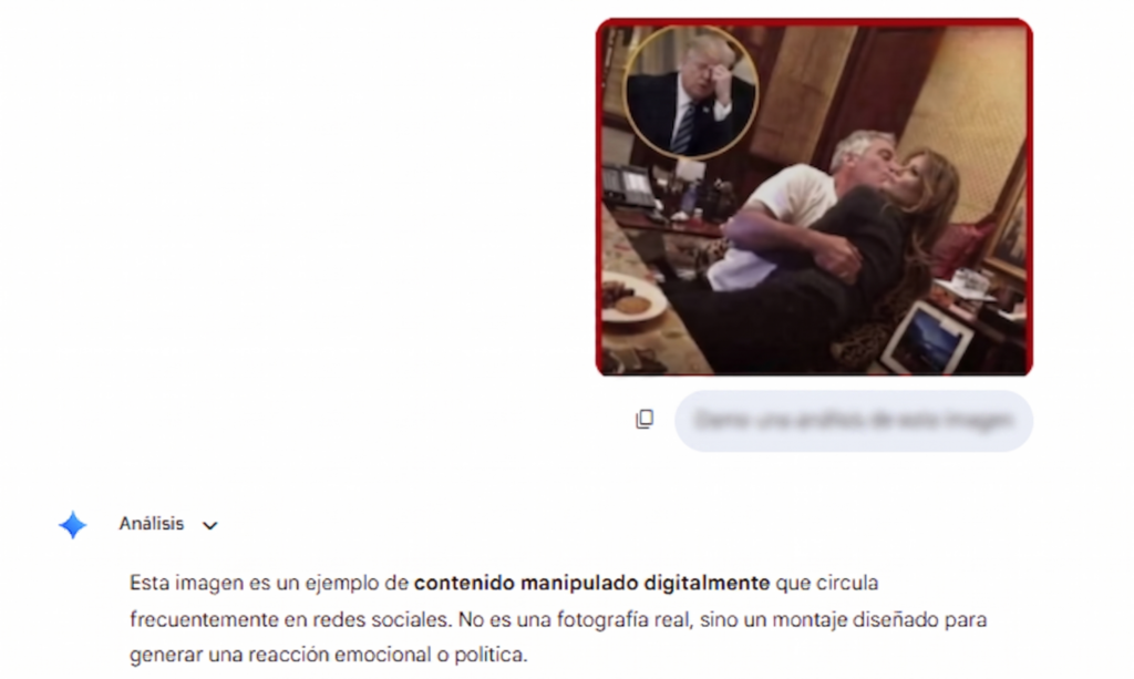 Pero no hay referencia alguna a la imagen. Tampoco en su perfil de Instagram y Facebook circula el contenido desinformante. Además, al usar SynthID, la herramienta de Google que identifica contenido generado con inteligencia artificial, se obtuvo lo siguiente: “Esta imagen es un ejemplo de contenido manipulado digitalmente. No es una fotografía real, sino un montaje diseñado para generar una reacción emocional o política”.