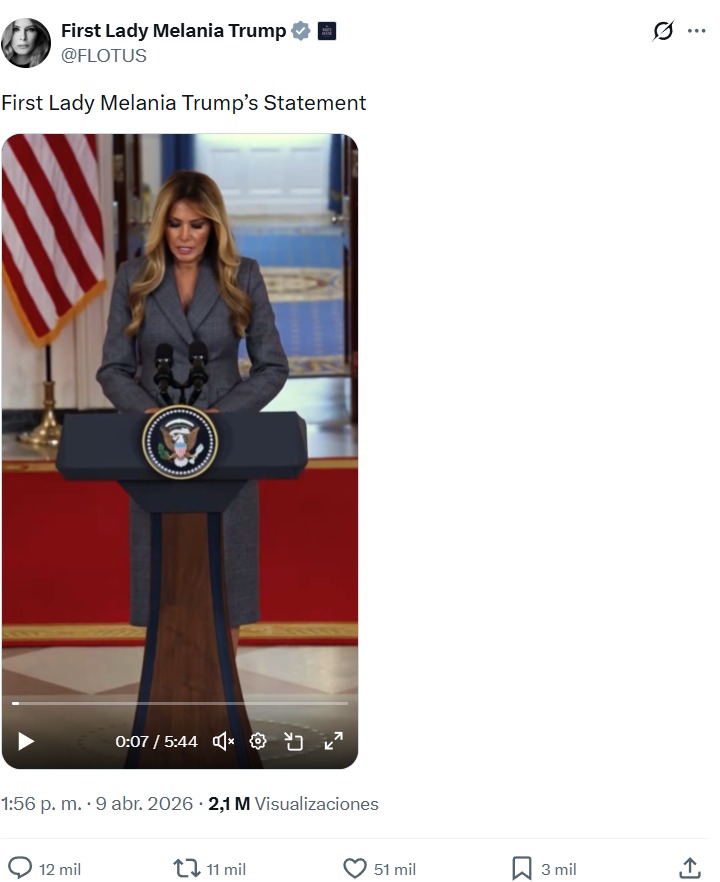 El jueves 9 de abril Melania Trump realizó una inesperada declaración ante las cámaras para negar acusaciones sobre ella y el fallecido Epstein, que no especificó. La primera dama, nacida en Eslovenia, negó categóricamente cualquier vínculo con el magnate, con quien ella y su esposo, Donald Trump, habían sido fotografiados anteriormente durante sus años de vida social en Nueva York.