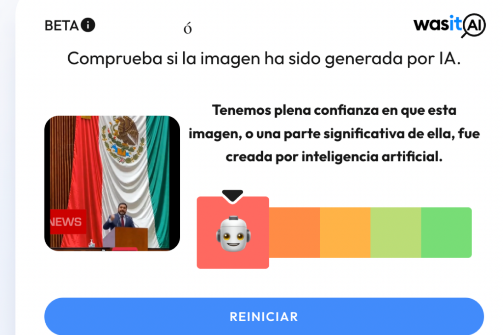 Debido a esto, ingresamos capturas de pantalla del video con desinformación a la herramienta WasitAI, que arrojó que el material es falso.