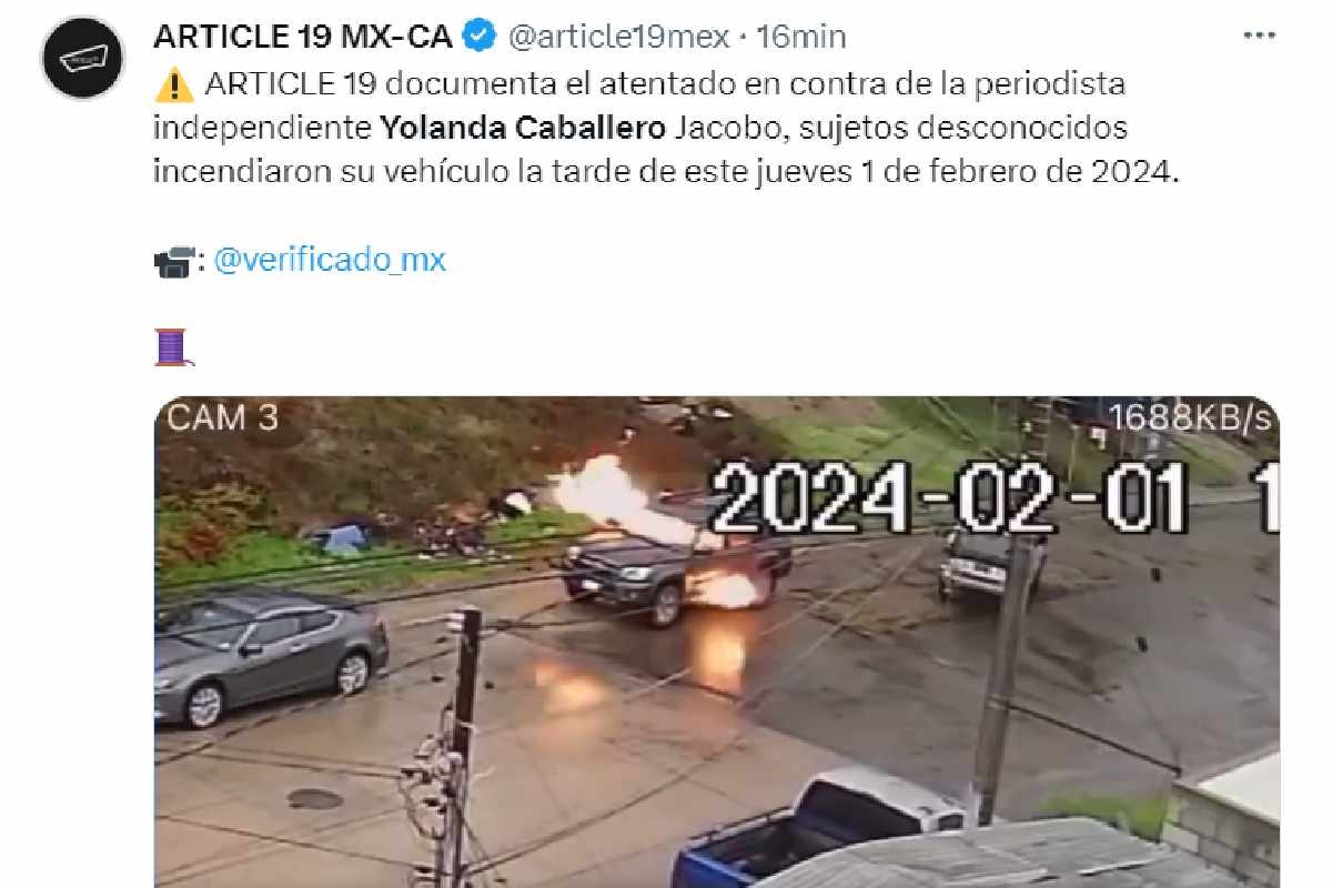 La organización Articulo 19 informó que documentó la agresión a la periodista y compartió un video en el que se observa a un hombre que rompe el vidrio de copiloto, lanza un objeto y posteriormente se observan las llamas.