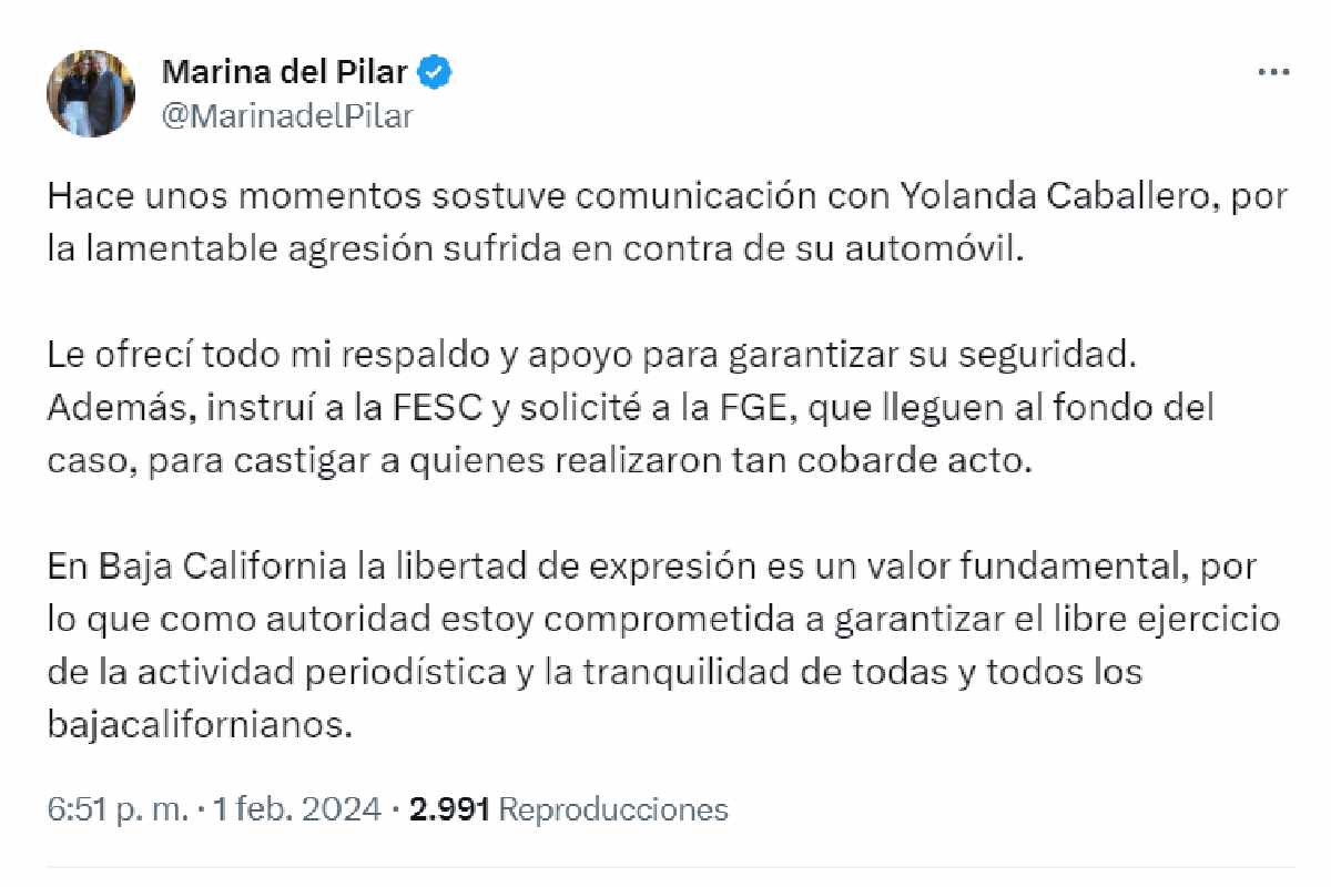 “En Baja California la libertad de expresión es un valor fundamental, por lo que como autoridad estoy comprometida a garantizar el libre ejercicio de la actividad periodística y la tranquilidad de todas y todos los bajacalifornianos”, publicó.